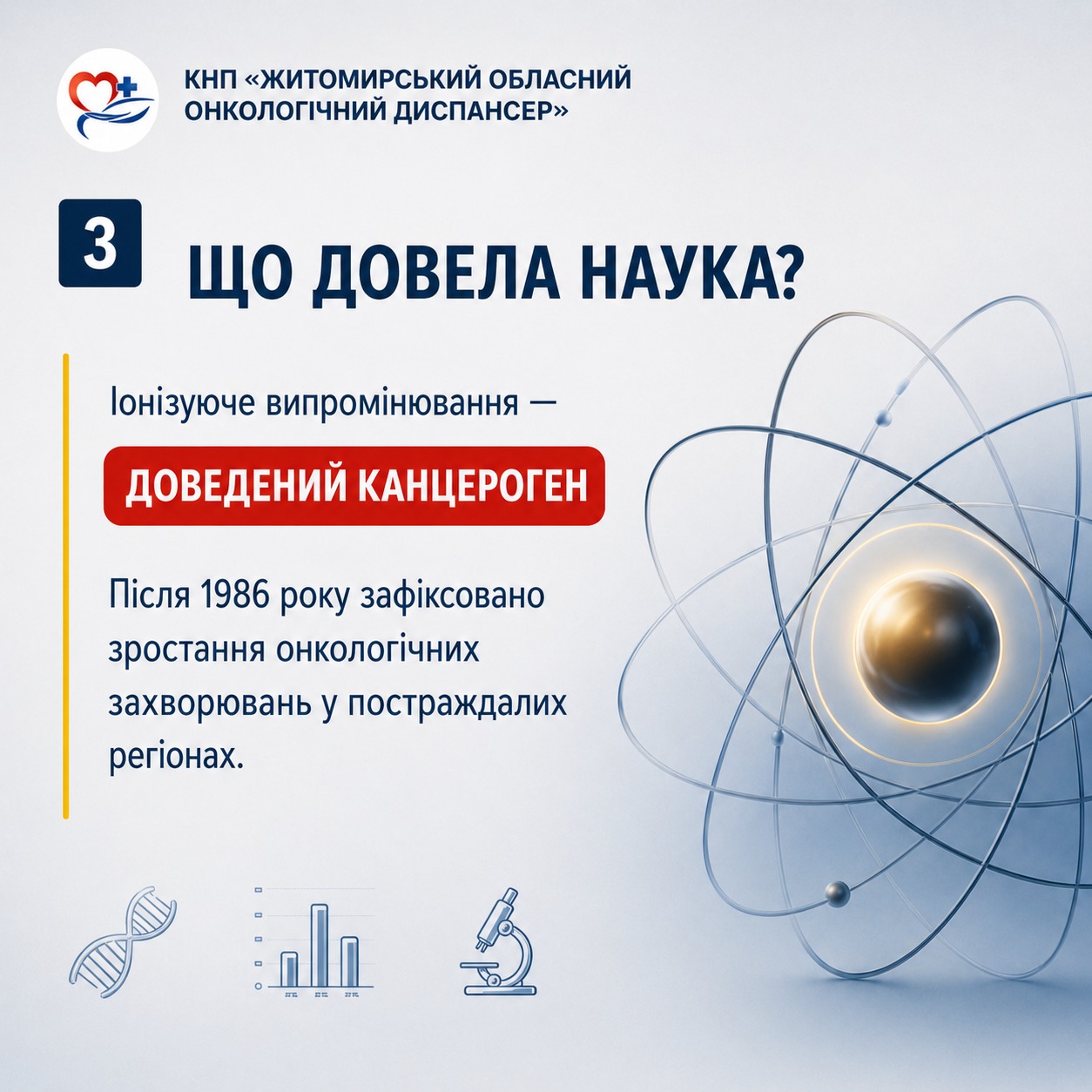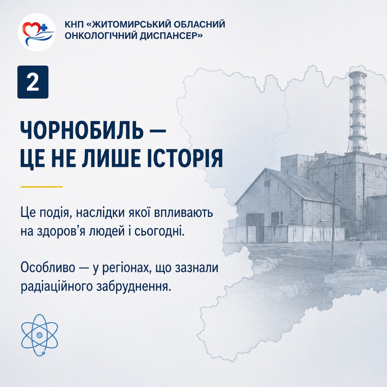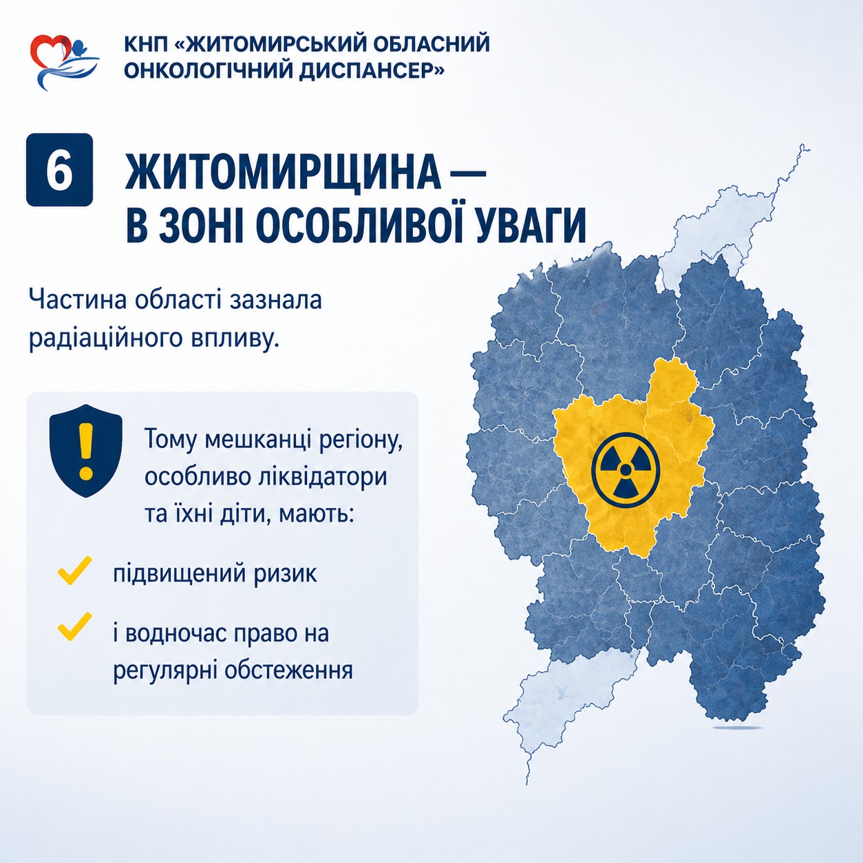 Житомирщина, частина районів якої опинилася в зоні радіоактивного забруднення, досі потребує особливої медичної уваги. Тому жителі області, особливо ліквідатори та їхні нащадки, мають життєву необхідність регулярно проходити онкологічні скринінги.