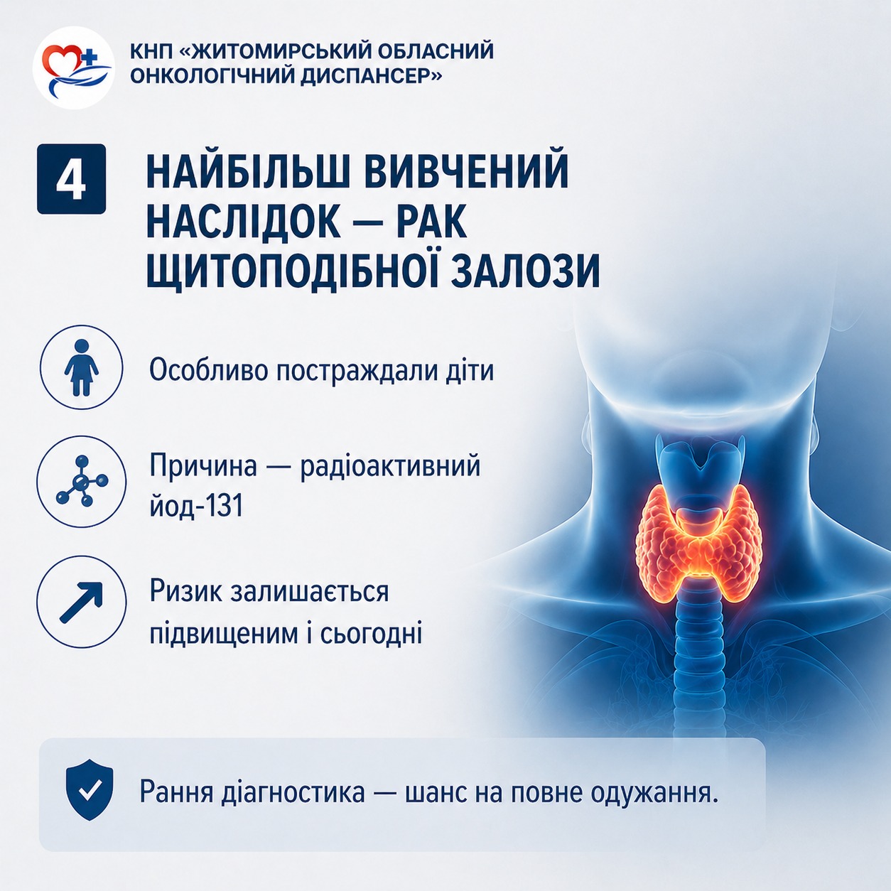 Науково доведено, що іонізуюче випромінювання є потужним канцерогеном, а події 1986 року спричинили значне зростання онкологічних захворювань, серед яких рак щитоподібної залози. Особливо вразливими виявилися діти, які вживали забруднене радіоактивним йодом молоко, а також ліквідатори та мешканці територій з високим рівнем опромінення.