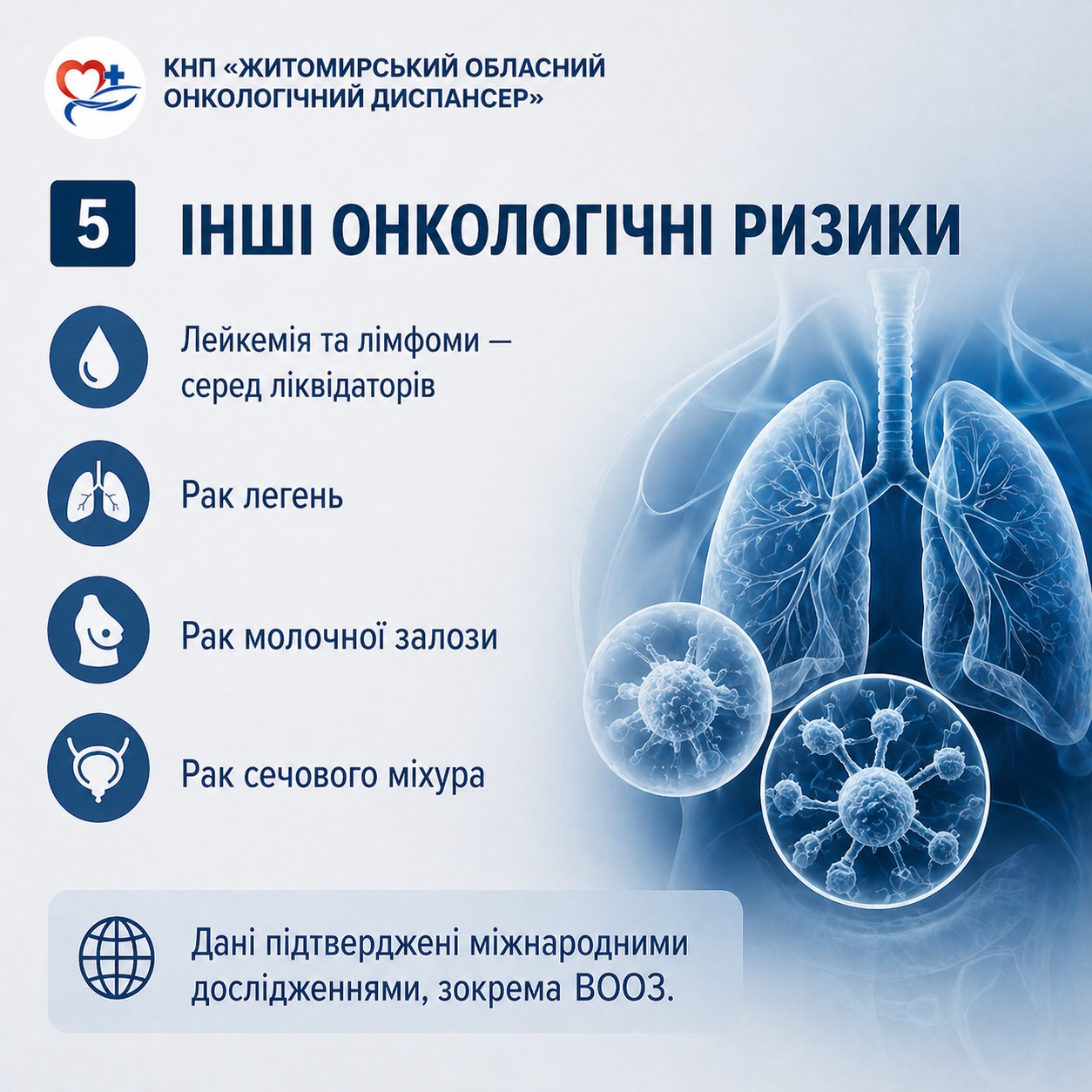 Крім того, серед осіб, що отримали значні дози радіації в перші тижні після аварії, зафіксовано вищий ризик розвитку лейкемії та лімфом, а ВООЗ підтверджує зростання кількості випадків раку легень, молочної залози та сечового міхура у мешканців найбільш постраждалих областей.