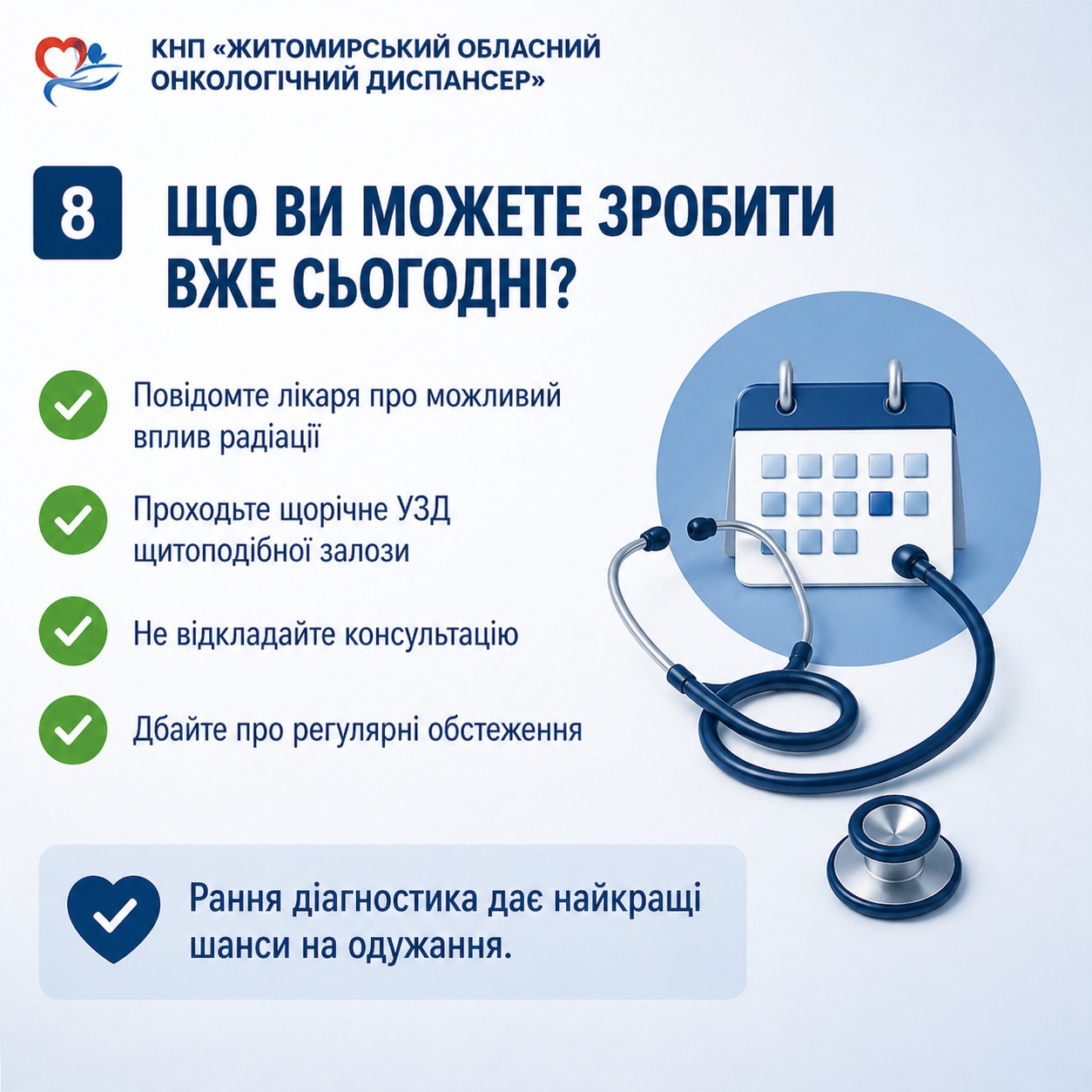 Для збереження здоров’я вкрай важливо повідомляти сімейному лікарю про належність до категорій постраждалих внаслідок аварії. Не варто ігнорувати такі тривожні симптоми, як збільшення лімфовузлів, поява вузликів на шиї чи незрозуміла втомлюваність. Основою профілактики є щорічне УЗД щитоподібної залози, яке є швидким і безболісним методом ранньої діагностики.