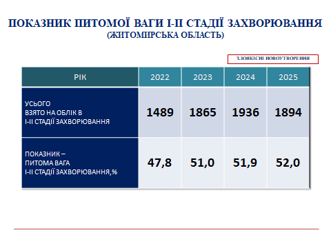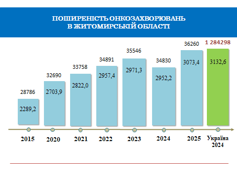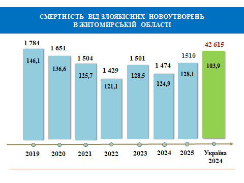 В області за 2025 рік зареєстровано 4009 нових випадків захворювання на онкопатологію, у 2024 році було діагностовано 4072 випадки. Протягом минулого року онкологія забрала життя 1510 хворих, роком раніше померло 1474 пацієнти.