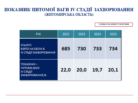 У п’ятірку захворювань, які найчастіше діагностували у пацієнтів минулого року увійшли рак шкіри, молочної залози, тіла матки, передміхурової залози та легенів. Проте найбільше випадків четвертої стадії хвороби виявлено у пацієнтів з раком легень, шлунку, яєчників, передміхурової залози та ободової кишки. У порівнянні з 2024 роком відмічається незначне збільшення кількості занедбаних випадків.